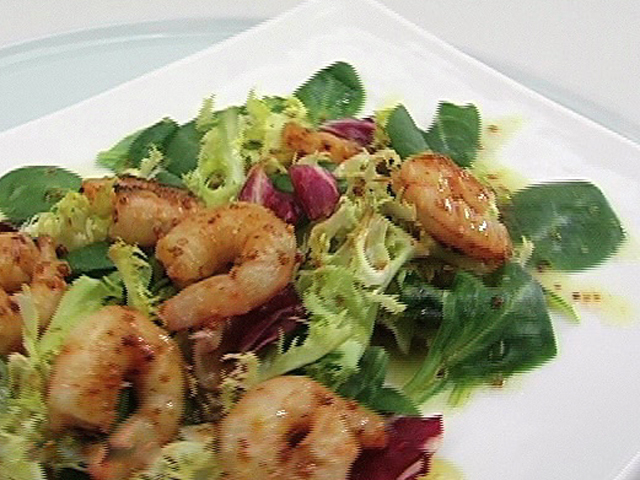 Свежий салат с пикантным вкусом.Состав:креветки — 50 гр;сок одного лимона;мед — 2 столовые ложки;несколько листьев салата;оливковое масло, соль, перец, зернистая горчица — по вкусу.